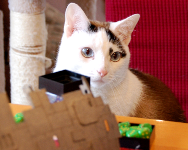 We rolled off, and I won. Honestly I had no idea whether I’d do better as attacker or defender here. But I looked over Drew’s list and especially at his squishy Sorcerer and guessed that he was hoping to be the attacker. So that’s what I chose, because few things in life are as sweet as depriving my dear brother of something he wants. After deployment I decided to let Drew go first, thinking he might come closer to me so I could charge him. Of course, he had no incentive at all to come toward me, being the defender, so that was really dumb. Instead he just one-shotted my glorious Trukk! Asshole!