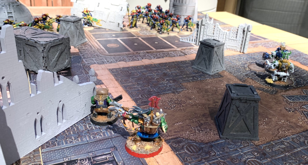 CHRIS: Josh and I got together (no ham this time, sadly) on a beautiful Saturday afternoon for some Deckhammer. Josh rolled the mission and came up with Behind Enemy Lines. I’d read up on the Crusade Incursion missions and knew that this mission punished slow moving armies, so my stubby little Ork legs were not thrilled but there you go. The mission revolves around each army trying to get to the opponent’s side of the board and take an Exfiltration action to be removed from the game. Points are scored based on the PL of units that you exfiltrate and also for any rounds you prevent your opponent from leaving the board. And also stuff like Da Jump doesn’t work. Lovely.