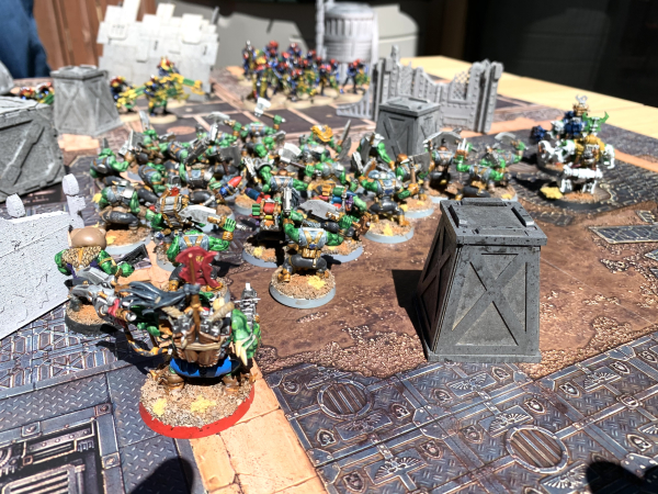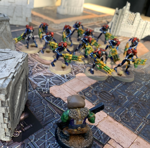 Long and short here, Josh kicked my ass. Things started off poorly when he went first and vaporized an entire unit of my shoota Boyz. But then things got worse when on the bottom of 1 I got greedy and tried a multi-target charge. His Overlord was 8” away, his Warriors were 7”. Not unreasonable, especially with a reroll. And yes, I failed the charge and my beautiful Allston Ratz, my 30 Boy unit, was left standing there with their green dicks swinging in the wind (we have it on the foremost authority that yes, Orks got nards).