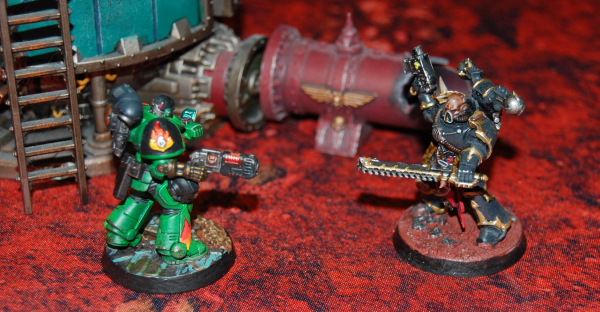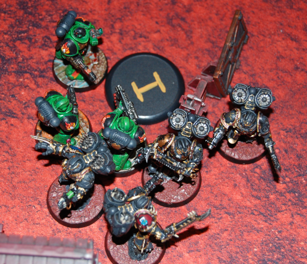 The second turn went basically according to the numbers. Allan turned his Redemptor around to blast the Obliterators and tied them up in melee when they (to the surprise of all) didn’t instantly evaporate. For their part, the Obliterators did a number on the Redemptor and most importantly kept it from shooting other units for a turn, for which I am eternally grateful.