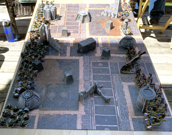 A great shadow on the surface of Vordanis Minor as the great orbital bombardment array passes over and for some reason does not fire.Deployment zones are 10” back from the center line on each side. Incursion still uses a 44”x30” board so that leaves 5” of deployment zone. Not great for cramming in a horde army! But at least I had a shorter distance to go to get to the other side of the board.