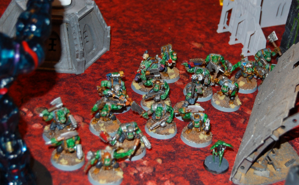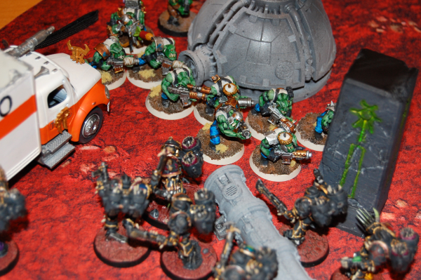 DREW: To be perfectly honest, I’m not sure what I thought I was doing there. I didn’t have a really good way to crack open the Trukk and feast on the delicious fungus inside but it worked out for the best as I tied up that entire corner of the table. In the meantime my Havocs started a game-long pattern of annihilation by blowing the Mek Gun off the map in one volley. Spoiler for this game, those dudes put in