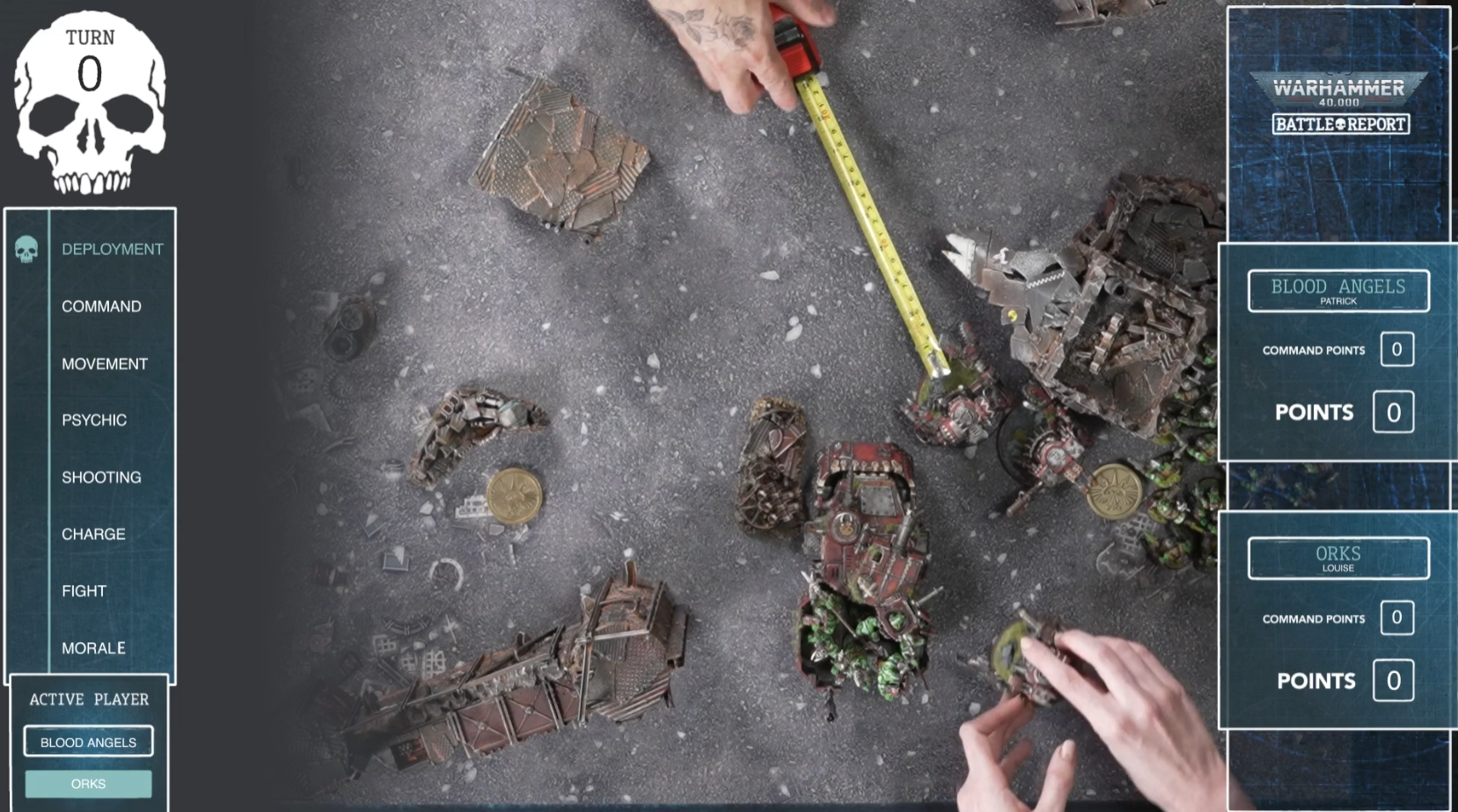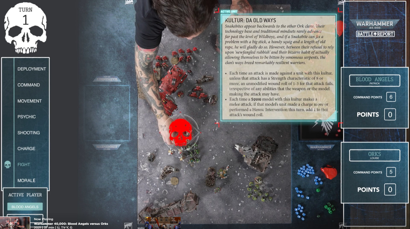 This is where Battle Report really blows your average YouTube hobbyist out of the water. Games start with one of the audiobook narrators talking about the forces at play while the camera luxuriates over the armies, which is a nice and immersive touch. From there the players walk through the units in their army, which are each presented on a cute little turntable so you know exactly what's what. The mission for the battle is explained, and the whole preamble takes like 10 minutes. Once the game starts, there's a multi-camera setup, clearly jumping between shots of the individual players, overhead views of the table and dice trays, and the occasional closeup of the armies duking it out. Over the course of the game there are brief talking head segments where one player or the other reads from some scripted material at the camera, usually between turns when a scoreboard shows up and catches players up to who's scored what. This is a great feature since it not only gives a viewer a good time to pause or stop and come back later, but also if your brain is cannonball-smooth like mine and your attention comes and goes, you can drift in and out of the game and still follow it. Similarly, graphic overlays frequently appear to explain stratagems, point out what unit is attacking what, and so on, so even if you're a newcomer you can still follow what's going on. Lastly, the shows end with a brief, unscripted post-game discussion between the players where they talk about the game. I honestly wish this was a little longer, as going over the triumphs and tragedies of the battle is one of my favorite parts of playing an actual wargame. The biggest praise I can give here is that it's easy to follow what's going on, which is pretty clutch in a game as complex as 40k.
