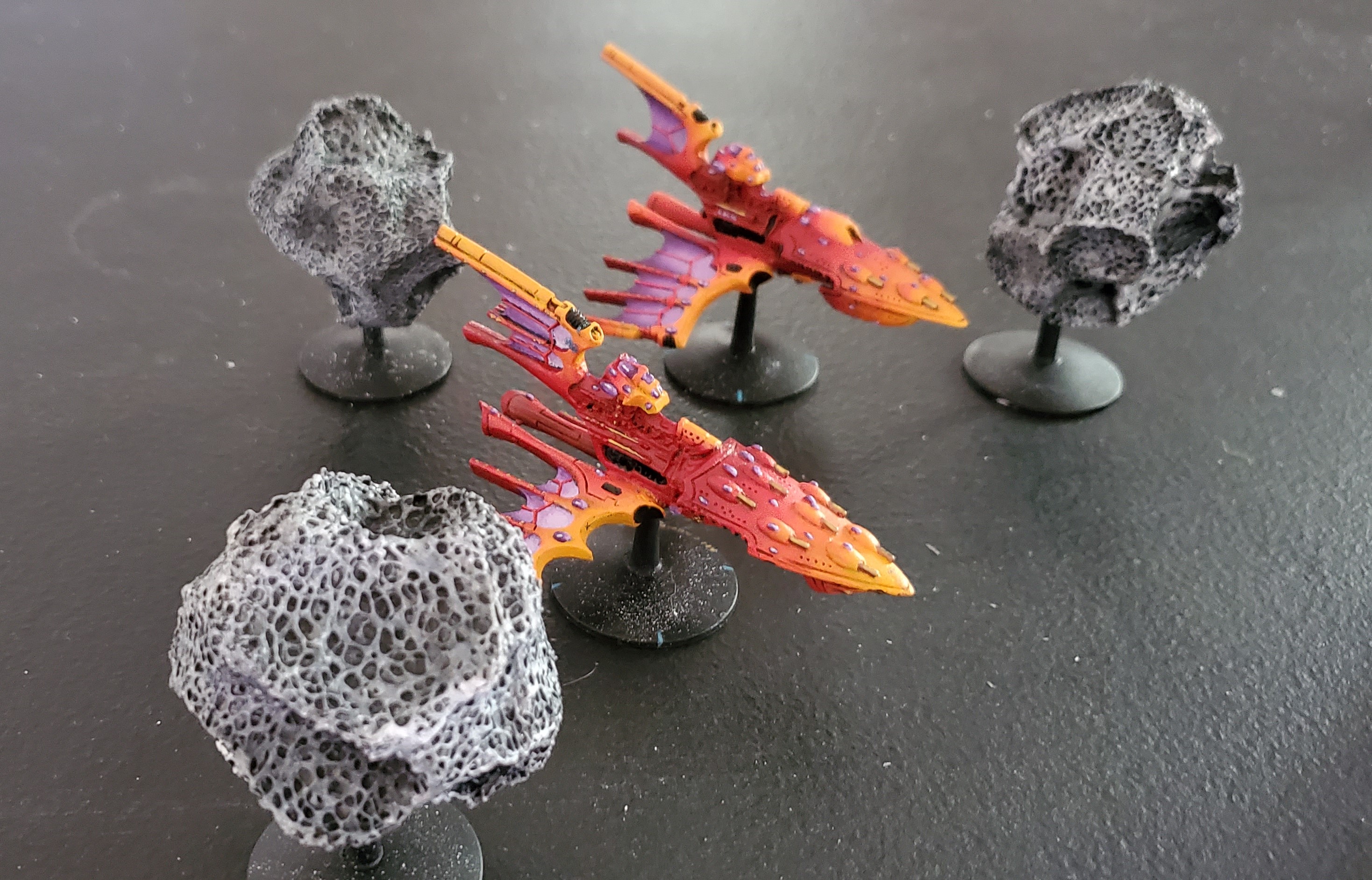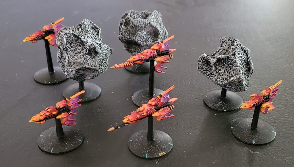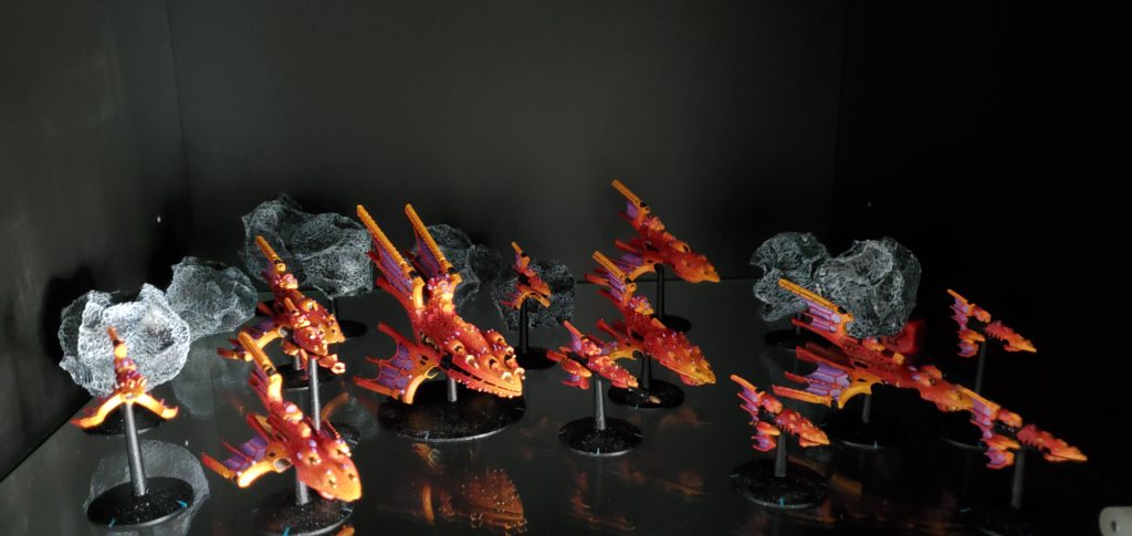 That said, there are significant drawbacks to all these boosts. All Eldar ships have a lower armor rating and fewer hullpoints making them susceptible to rapidly taking damage and becoming crippled. There is also a 50% chance to cause critical damage to Eldar ships with each point of damage they sustain which can rapidly deteriorate their capabilities. The range of their weaponry, across the fleet, is among the shortest in the game and their most significant strength, their mobility, may be greatly hindered by poor positioning. When effectively managed, they are the fastest ships in the game, but a savvy opponent can maneuver and force an Eldar player into a position where they cannot take advantage of their speed. This is because Eldar ships have three profiles based on their relation to the ‘sunward edge’. Putting an Eldar fleet in a position where they cannot effectively capture the solar winds leaves them open to counter weapon battery fusillades that will utterly cripple or destroy the fleet. Unlike shields used by other races, the holofields that are so effective at stopping non-weapon battery fire, do not actually protect the ship from things like blast markers, explosions, or gas clouds – which means that even basic phenomena can force attrition on Eldar vessels where a single point of damage can often have cataclysmic cascading effects. Finally, Eldar vessels, pirate princes, and rerolls are expensive especially among the Cruiser classes.