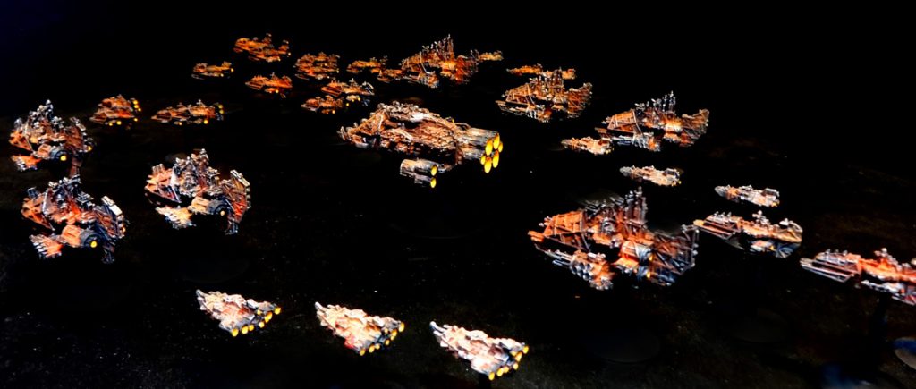 The Ork fleet is formed up of a suitably rag tag group of ships that suffers from a lot of the variability that is iconic of GWs early 90s-era games. While Eldar receive a universal leadership bonus, Orks suffer a universal leadership debuff, -1 across all ships and squadrons that can make an Ork fleet rather unpredictable and unwiedly to manage. This is offset somewhat by being able to take multiple Warbosses across a fleet which may provide additional rerolls cheaply, as well as providing additional benefits to boarding actions, weapon buffs, shield enhancements, or damage control buffs. Orks receive a significant benefit in that they will always pass a leadership check for All Ahead Full special orders although the speed boost is halved. While Ork cruisers are a bit ponderous, this does make them at times surprisingly fast, and Ork escorts can be downright speedy as they open palm slam that big, shiny, red ‘ere we go’ button on the bridge.