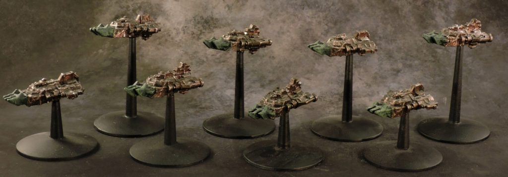Cobbled together from the ruined remains of ships and other space junk, Kroozers are hulking weapon battery platforms – slow moving at a top speed of 20 cm (ignoring the All Ahead Full), they are resilient with 10 hit points (vs the standard 8 for a cruiser, or 6 for Eldar) though they sport only a single shield. They are armed with an assortment of guns and heavy gunz on the beams and bow of the vessels and are entirely made to smash into the enemies formation, unleashing volleys in all directions, before slamming into a ship and destroying from the inside by sending combat hungry Orks rampaging through its innards. At 155 points, these are sturdy ships to anchor the fleet.