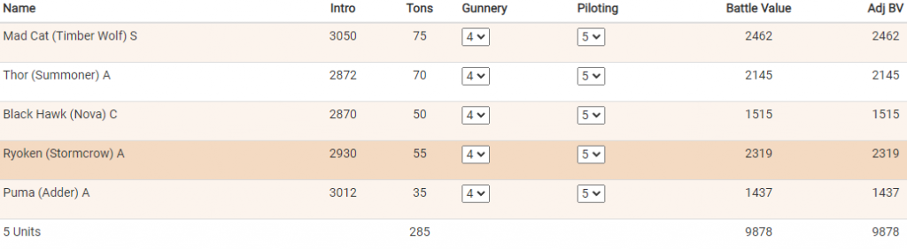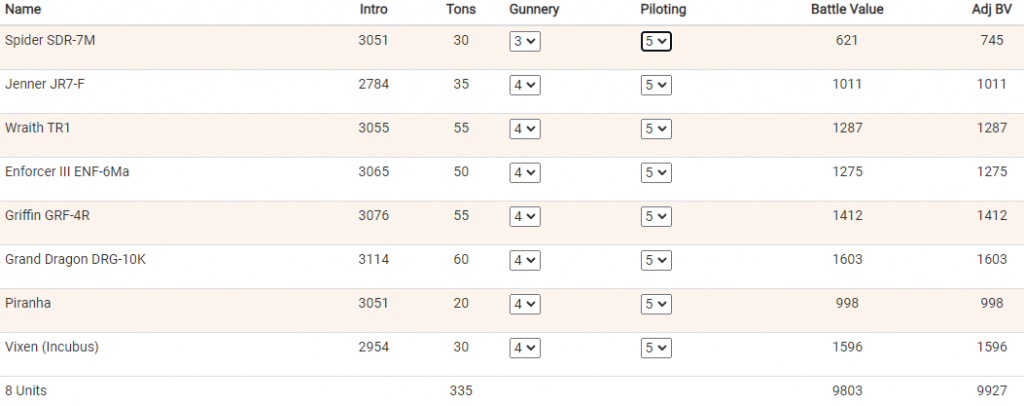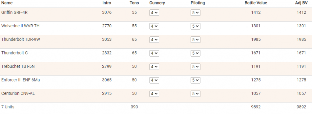 Here is a couple of sample 10000 BV lists for the Ravannion Special, one with no limit and one with a 8 mech limit.