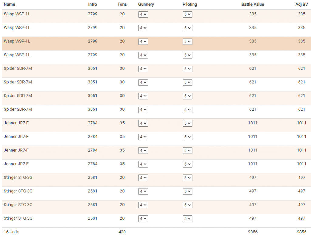 The sorts of mechs and variants that this list wants is very simple. Anything less than 1000 BV, with a movement of at least 6/9. If you are playing without a maximum unit count, I would recommend going mostly for Wasps, Spiders, and Stingers, with a couple of slightly heavier light mechs, like Jenners, Piranhas, and Mist Lynx. Ideal play is using the ultra cheap 500 BV losers to soak shots and fish for rear arc shots, ganging up on enemies and making sure that each of your opponent's mechs is fighting two or more friendly ones, and the more expensive 900-1000 BV losers to finish things off and apply pressure to the enemy. If you have a maximum unit limit, shift heavier, with the bulk of your force being Jenners and other fast 30-35 tonners, with a few fast mediums like the Wraith or Griffin 4R. The playstyle is still mostly the same, with less of a focus on the swarming and ganging up on things and more focus on getting behind things and backstabbing them to death.