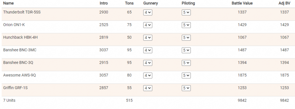The strengths of this force is that, BV for BV, slow, heavily armored mechs are insanely efficient. They can carry a decent amount of gun and take a lot of punishment. A 1000 BV Jenner JR7-F has 15 center torso armor, but a 1000 BV Hunchback 4H has 26. They are slower and tend to get hit more often, but they are much less susceptible to a single hit from a large weapon landing and completely destroying them. In addition, the Hunchback 4H has a 30 point alpha strike at close range, with 10 points at mid/long range, while the Jenner only has 20 at short and none at mid or long. Now, the Jenner will have an easier time getting into range, but once it is there it does a lot less damage.