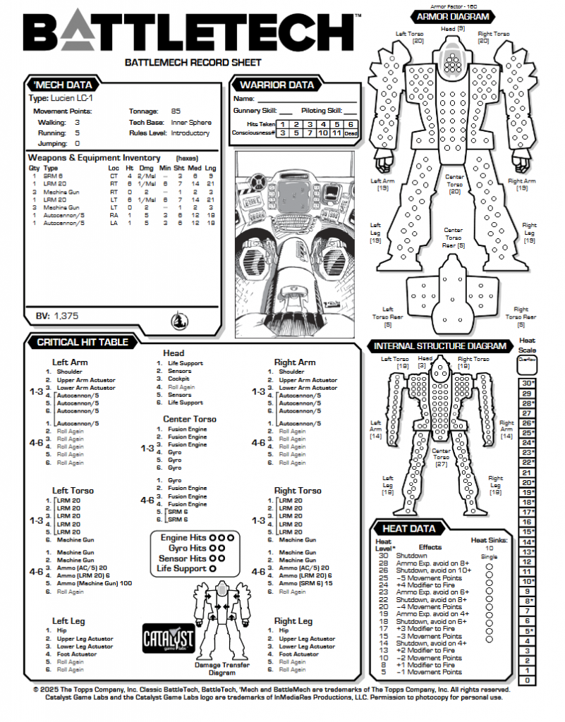 Record sheet built as my best guess. Feel free to print this and use it?The LC-1 comes in at 1375 BV with its AC/5s and LRM-20s. It is undersinked with only 10 SHS, with its long range firepower coming out to 14 heat plus movement. 10 tons of armor is very weak for an assault mech of its weight, but it is barely adequate if laid out as above with 20 on the CT and side torsos, 15 on the limbs. He doesn't give any specifics for where the guns should be mounted, so I made my best guess and tried to make it as symmetrical as I could. It has a fucking lot of explosives in it, which are not behind a very thick armor belt on a mech this slow.