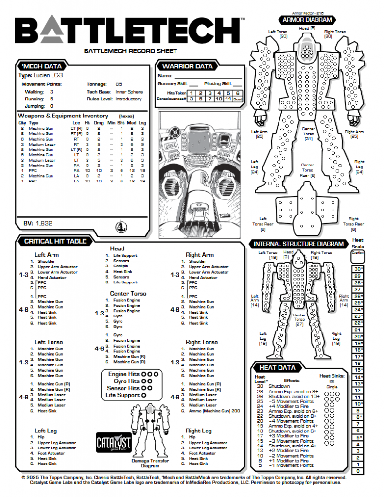 The LC-2 comes in at 1281 BV, much more reasonable, and is a vastly different animal to the LC-1. Keeping those AC/10s around hilariously doesn't actually make a big difference for heat management, with the LC-2 also building 14+movement against only 10 SHS. The difference is in the weapons. You can fire either the AC/10s or the LRM/10s and be heat neutral with either set, and the AC/10s plus the SRM/6 only build movement heat. This mech is way better set up as a bracket firing mech, with LRMs to shoot while it closes in. That close in punch is pretty great with 2 AC/10s, and the poor armor, while it does hurt, is more than compensated for by the low price. This mech doesn't want to shoot all its weapons at the same time like the LC-1 does, and I would argue is a lot closer in use case to the intended 1980s Lucien that comes out badly overweight.