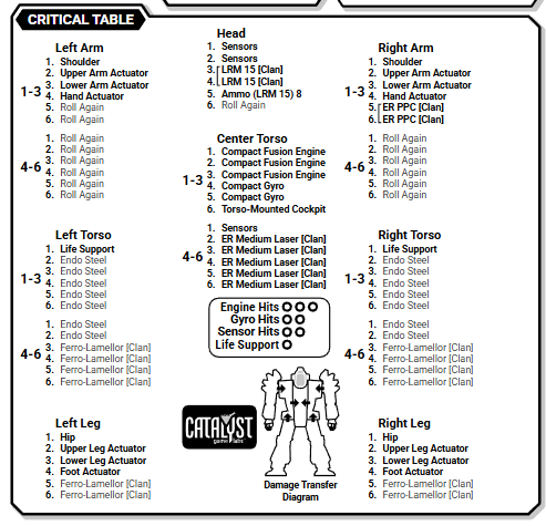 This quantity versus quality competition meant that Clan players could reasonably expect for some of their elite OmniMechs to be crippled from lucky hits that would destroy an engine or gyro slot, whittling away at their already-punishing numerical disadvantage. The Floating Criticals optional rule emerged from this outcome, making through-armor criticals less likely to cripple or destroy a ‘Mech from a single hit.