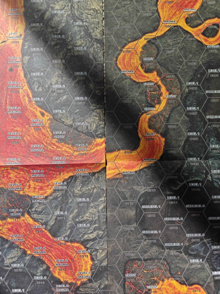 The northern part of the map set is built around a magma dome vent that serves as the centerpiece for four full mapsheets, and has both higher elevations and significantly higher density of magma hexes than the other sheets. This is, frankly, the worst part of the map pack. Some map sheets are almost half-covered in magma hexes, and while you do get a punchboard sheet of crust, building, and bridge tokens to create pathways, it’s far from ideal. The elevation changes are also not well-defined by the art, which gave me some flashbacks to trying to play Crystalline Canyon from Map Pack: Alien Worlds. There are some funky ideas here that might be enjoyable under the right circumstances, namely the two “Lava Tubes” maps that give us some honest-to-Kerensky tunnels, but I can’t see these being in anything close to regular rotation for pickup games.