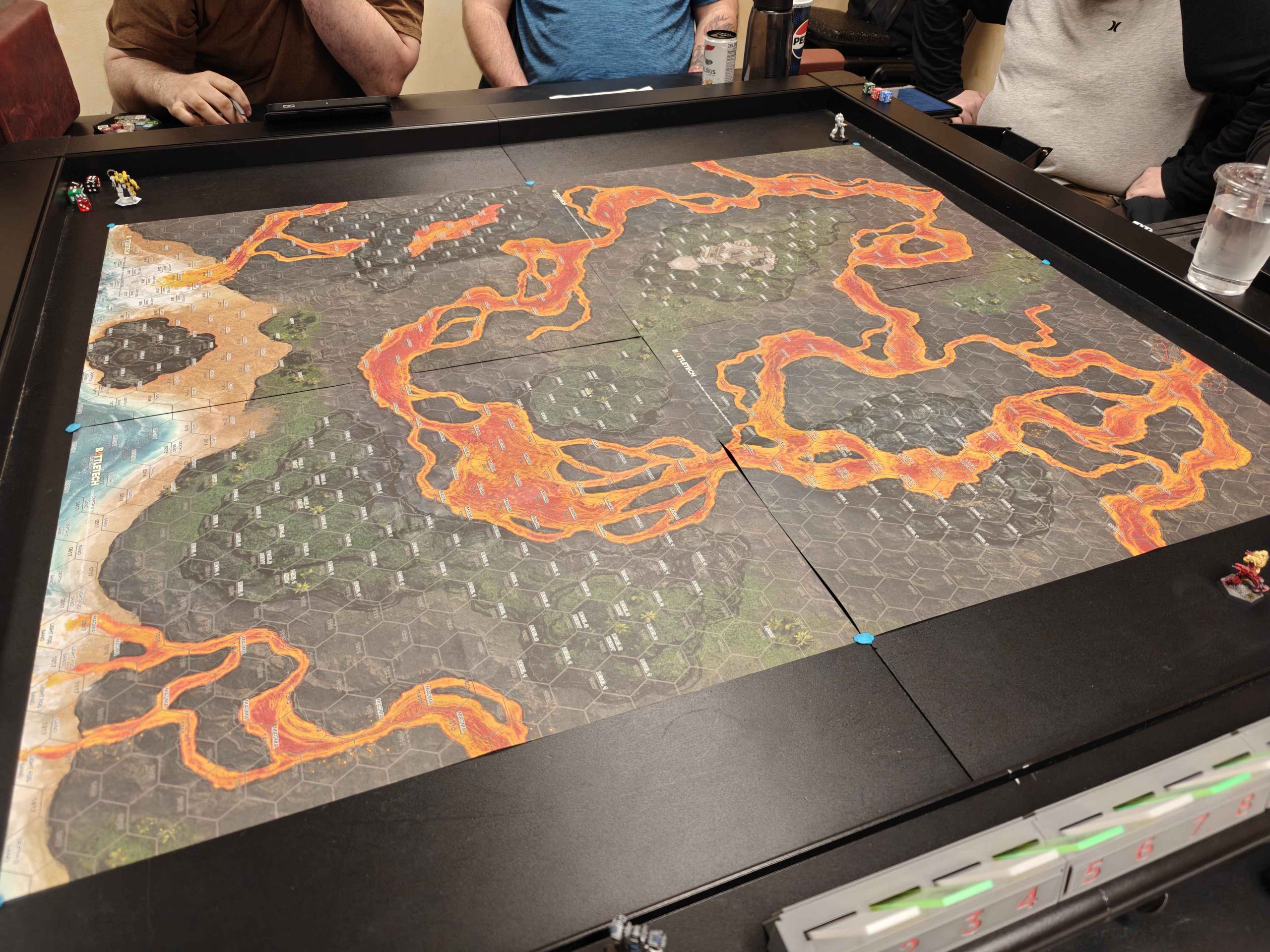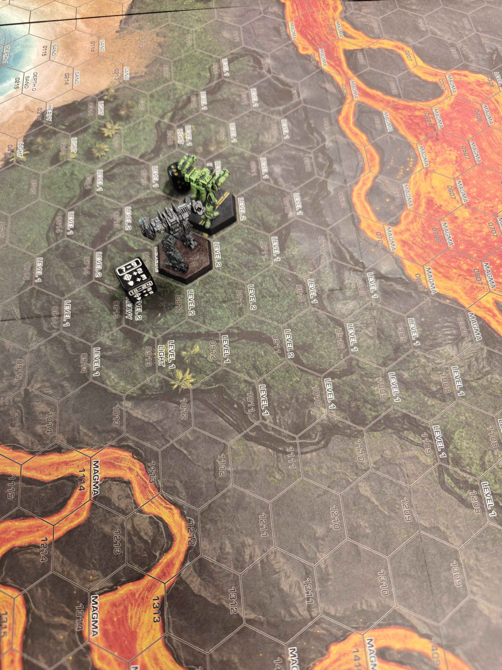 I played on the southern 2x2 combination (10, 11, 14, and 15), and it was not a particularly good map for gameplay, especially if you have any non-jumping light mechs. There’s too much magma, not enough space to cross it, and it’s far too deadly to even exist near it. 2d6 damage to each leg, automatically, makes it something that a light mech can do once ever. But what’s worse is that you can’t stand next to it, because getting charged, pushed, or DFAed into the magma is an instant existential threat. You take 2d6 to each exposed location immediately on moving into the hex. If that move involves falling, that’s every single location including both front and rear torsos and the head. It’s considered an attack, so this would also be a consciousness roll.