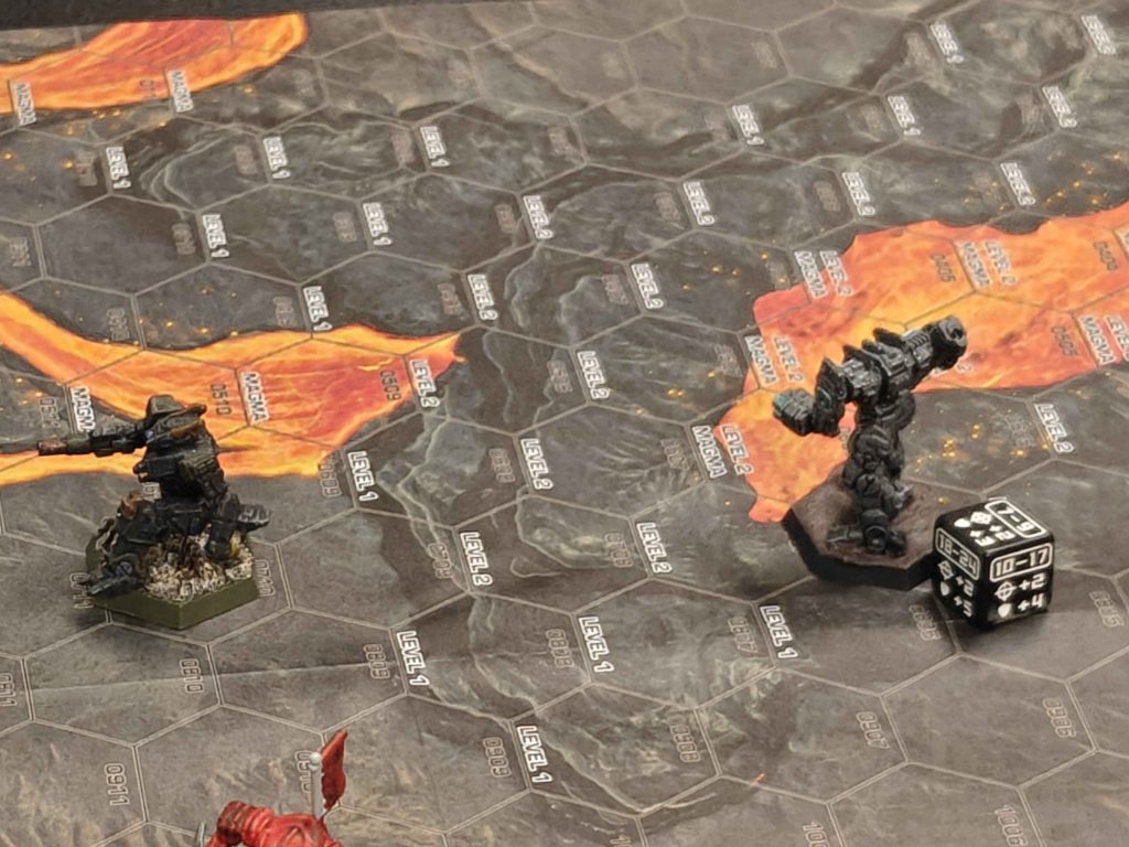 Subsequently, you start your next movement phase in the magma, and have now taken 4d6 damage to the head, which is a 76% chance of death (not counting the so far 2 pilot hits/consciousness checks). With a +4 PSR, you’ve also probably failed the seatbelt check (so we’re looking at a 7+ consciousness roll at best) and failed to stand up. Standing next to a magma hex is not something that should ever be done, which dramatically limits the number of hexes on the map that you can end a turn in, and means that while light mechs are in trouble because they risk their legs melting while trying to cross, slow mechs don’t have the movement speed to avoid standing near the magma.