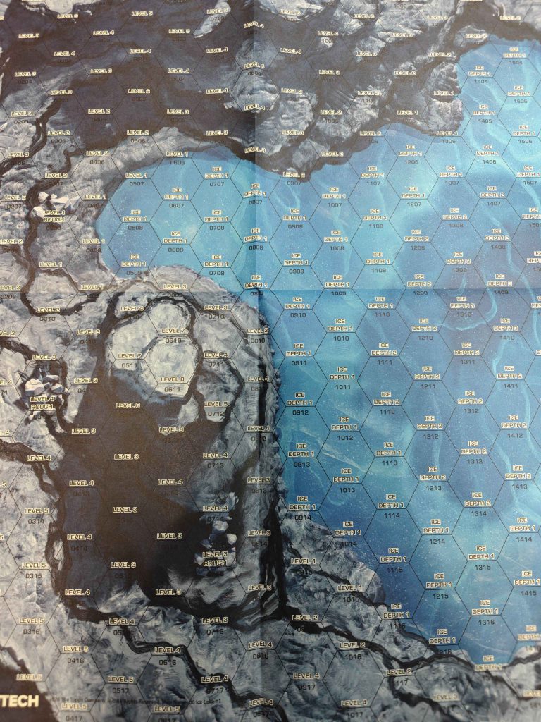 It almost looks interesting, but in practice is most of a map sheet of level 0.Worth noting here is that the ice rules published in this set of maps don’t match the rules in the missions playtest packet. If you use those rules instead of the simplified ice rules here those hexes become somewhat less miserable to exist on. It does seem strange that Catalyst would know that there will be new ice rules in the new core rulebook that releases before this map pack goes to retail (Map Pack: Glacier is currently expected for late September, per the Tuesday Newsday stream) and yet still print these. They’ll be completely incorrect when they actually go up for sale.