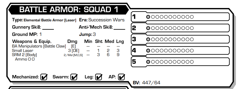 The Record Sheet of a perfidious, foul Toad. Credit: Catalyst Game LabsBattle Armor record sheets are a little different from mech ones. Basically, each member of the unit is equipped with the weapons on the left side. They cannot run and are stuck at one speed, though they don't take a penalty from jumping and have no reason not to jump. Their overall health is on the right, with each trooper having a bar. All incoming damage hits a random trooper, so they tend to spread damage around. An Elemental has 11 health, 10 in the form of armor, and 1 representing the squishy, fleshy trooper inside of that armor. This is an annoying break point, because it means that most IS grade heavy weapons will come 1 point of damage short of killing one, and even most Clan grade weapons will come up 1 to 4 points short of a kill. They come in squads of 5, which is 55 total health. On top of this durability, they can jump 3 hexes a turn and have an innate +1 to hit penalty due to their small size. This means you are basically always going to be at a +3 to hit penalty when firing at them, which makes them annoying to hit and, comboed with their armor hitting a perfect breakpoint and their innate damage spreading, makes them somewhat of a nightmare to kill.