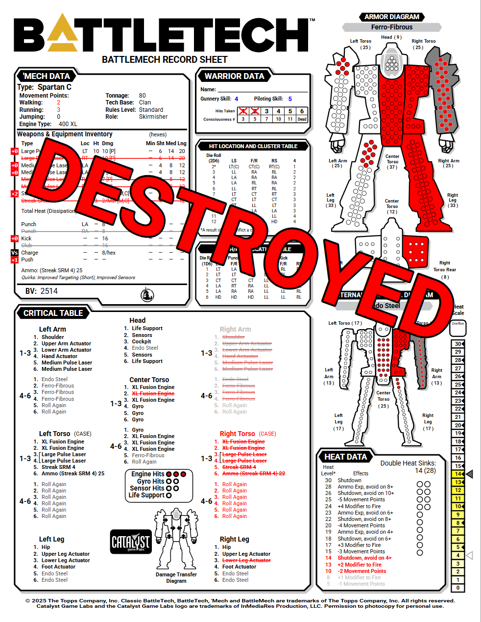 If you take a look at this record sheet you can see a common theme across all my games - mechs die by having one side completely ripped off, while the other side is nearly untouched. It was reliably happening in 1-2 fewer turns of shooting than what I'd expect based on previous experience, as there was very little damage that ended up being wasted into other locations.One initial thought about the playtest was that it would allow you to better control what side you're getting shot, and hide a heavily damaged side from the enemy, and that absolutely did not play out in practice. To do that you had to a) win initiative and b) be willing to move that mech last, so you're sacrificing the offensive offensive abilities that winning initiative gives you for a little bit of defense. Turning to hide a damaged side also generally reduces your TMM, and often stops you from completing any mission objectives. It was just never something we were able to effectively do after the first couple turns. A close range attacker just doesn't need to move very far to get back into whatever side you were trying to hide, assuming you don't move it last.