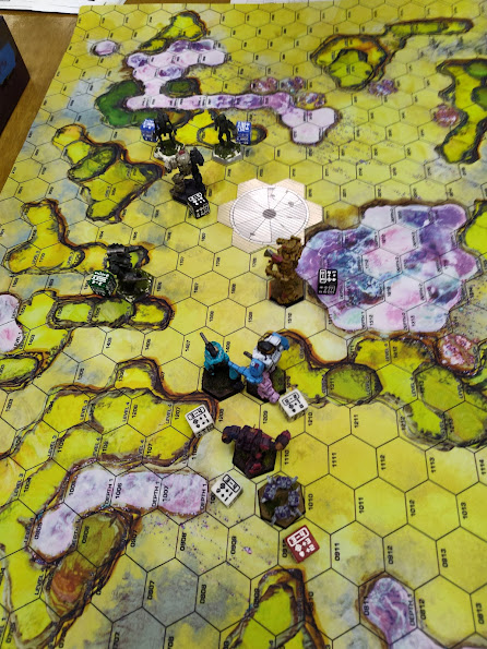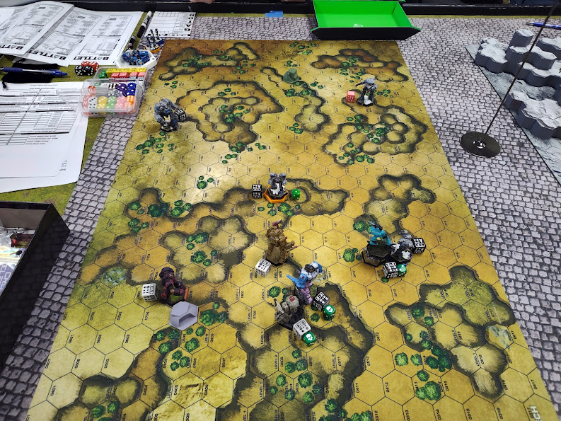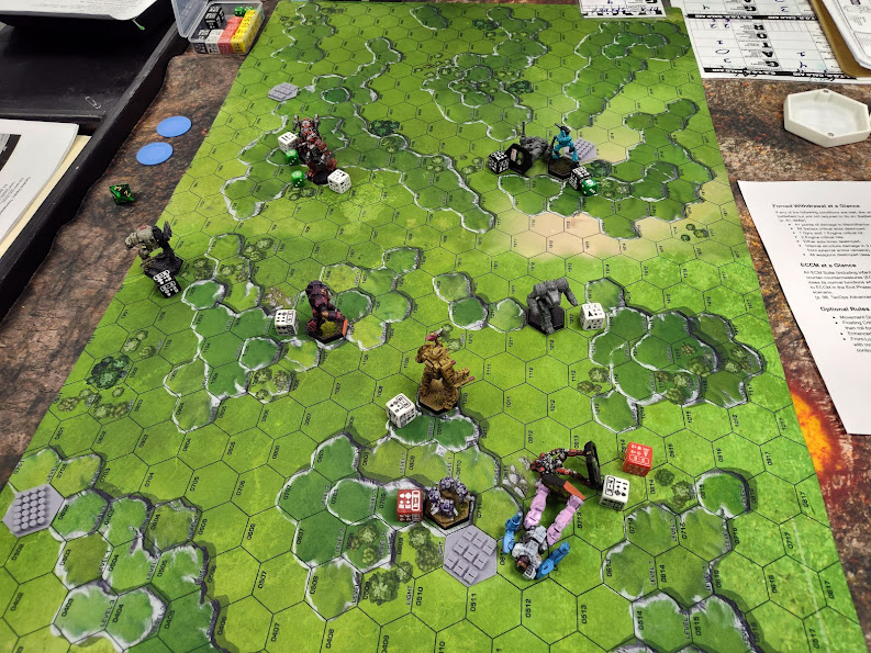 Where the killing started... Photo Credit: Lynn B.Throughout those initial turns I'd managed to keep my Flashman 9M glued to his Hatchetman; despite its greater speed, he kept jumping it in places where I could bring the close-range lasers to bear and I was simply wearing its armor away with all the inexorable inevitability of the tide. On turn 4 the Flashman got into one of its side torsos and left its structure points on single digits, perilously close to death-by-Inner-Sphere-XL-engine. Unfortunately for the Hatchetman, the Thunderbolt had moved out of line-of-sight of the Crusader that turn, so I YOLO-lobbed LRMs at the Hatchetman from downtown. My TN was shitty, but I had plenty of ammo and heat capacity, so I had no reason to not pull the trigger… and then BattleTech Ensued.