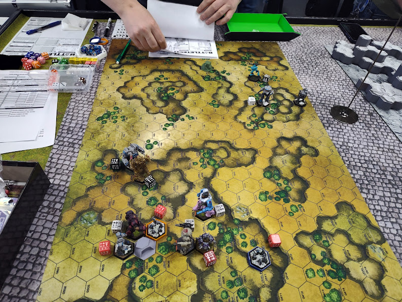 Unfortunately, in the moment I chose the most unflattering angle possible for a photo of my hand, and by the time I wrote this article they were chipped to all hell. Oops. Photo Credit: Lynn B.I got a chance to play practice games of mission 1 and 2 against Tentacle and Liberty the night before the tourney and my dice were absolutely cursed. In two subsequent games I failed a basic 5+ piloting roll to stand my Flashman, hit its head during the fall, and had my pilot go unconscious off the pilot damage (once by rolling snakes on a 3+). It was my fervent hope that this bad luck wouldn't follow me into the tournament itself…