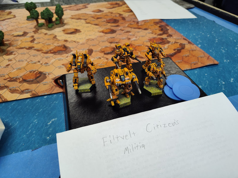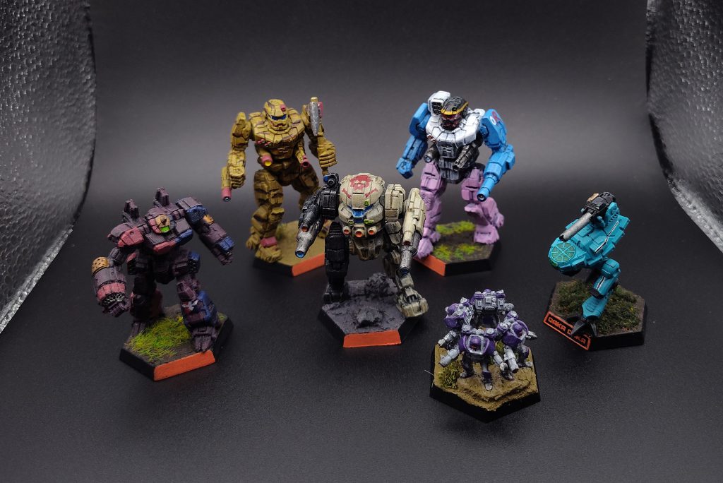 I don't have the income, or really the painting bandwidth, to have a full set of bespoke mechs for every tournament I play, and when I settled on my list I already had two Banshees, a Flashman, and a Crusader painted… all in different paint schemes! Rationalizing that it would be weirder if some of the units’ schemes matched and others didn't than if none of them matched, I went ahead and painted the Blitzkrieg and the battle armor in new schemes for a completely variegated force.
