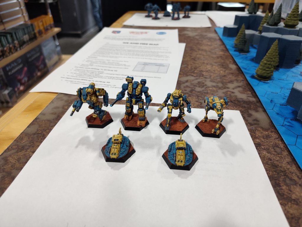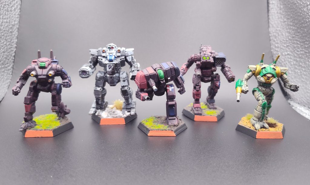 Yes, I did paint them myself this time! Photo Credit: Lynn C.The idea was to present a force in which every unit could hold its own, without an obvious weakest link to pick on, and with killing power sufficiently distributed for my game-plan to survive an early headshot. Piloting 5 is unfortunate when playing with expanded damage modifiers to PSRs, but I’ve kind of gotten used to playing around the knowledge that my mechs are going to fall down at inopportune times, and I’ve also found that Piloting 4 isn’t really sufficient to make them reliably keep their feet, either. That said, had I seen the secondary objective list in advance, I definitely would’ve invested in Piloting.