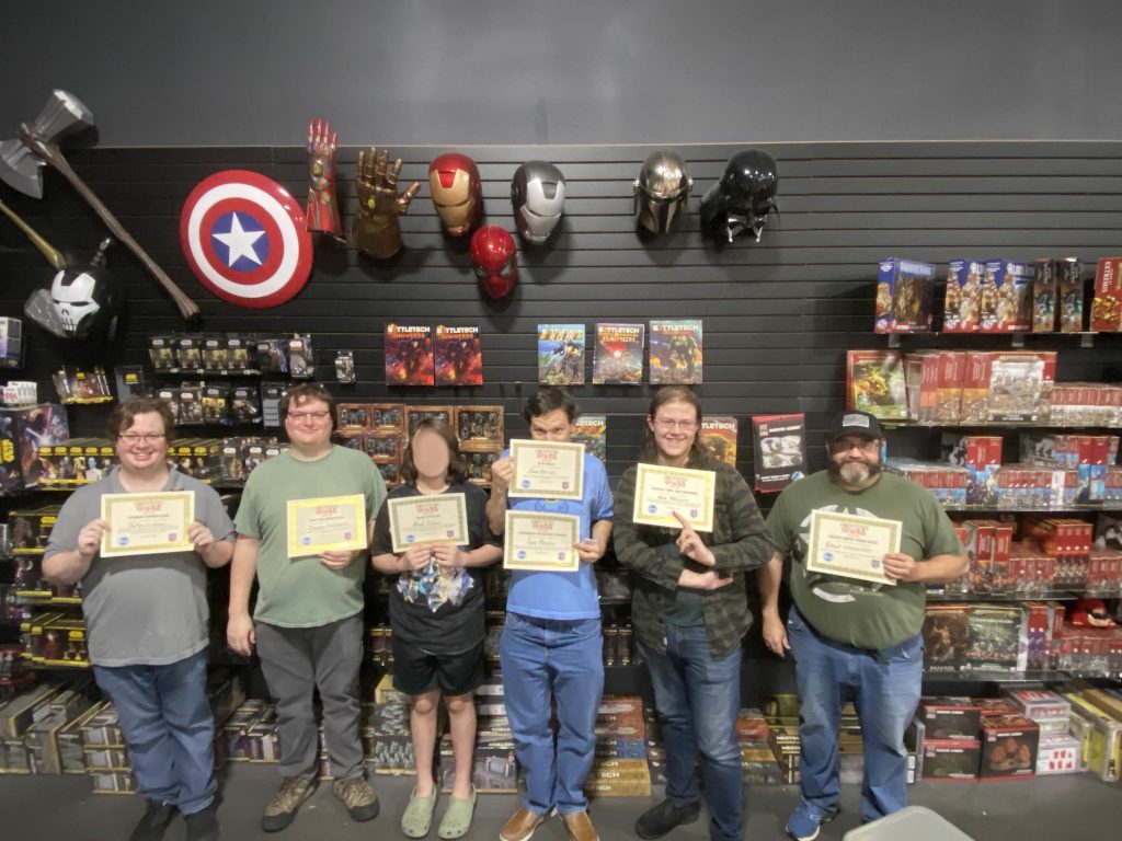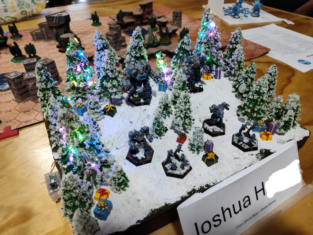 I expand a bit more on what this commitment to the bit entailed down in my list analysis. Photo Credit: Lynn C.The commemorative certificates included the usual suspects, like the wooden spoon (“Didn’t Hear No Jingle Bell”), good sportsmanship (“Heart Grew Three Sizes”), etc., and acknowledged some mission-packet-specific achievements (like a certificate for the player who scored the most feats of strength for secondary scoring, which very much went to ChahDresh), but also acknowledged some more unusual circumstances. Though the packet allowed anyone to take one in their list, only one player actually brought a Unique mech (Hohiro Kurita’s Dire Wolf config), and he got a “Unique Snowflake” certificate out of it, for instance. Another player earned “Two By Two, Like Reindeer” for taking a pair of the same ‘Mech chassis and also a pair of the same vehicle chassis (two Crusaders and two Manticores in a Lyran list). No prize for using 8k BV exactly this time around, alas (likely because I wasn’t the only one who did it)