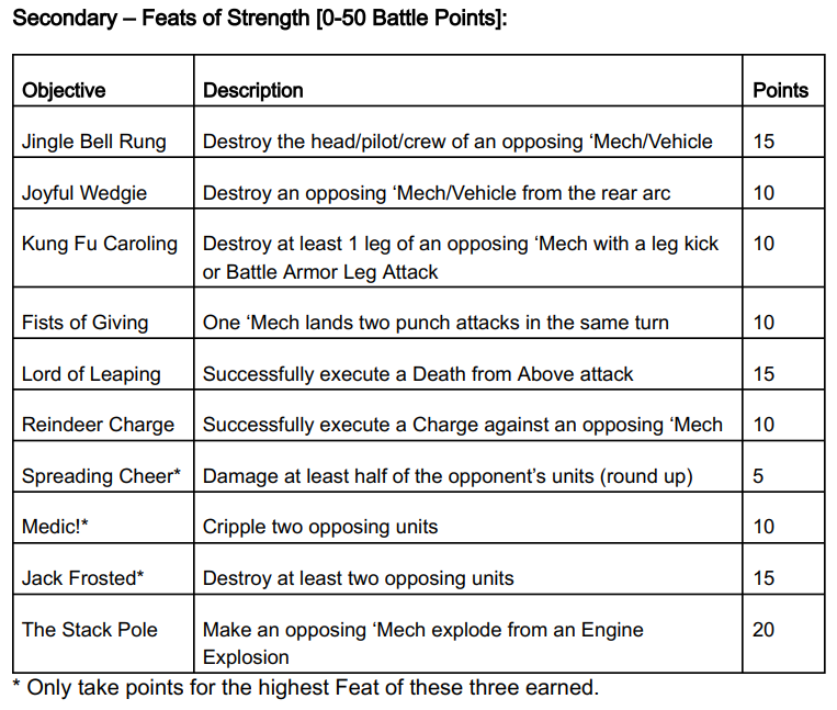 Missions were again revealed at the event, and scoring included a significant extra wrinkle this time. In addition to each mission having its own unique primary objective(s) and a “combat score” based on enemy units crippled and destroyed being tracked (a requirement of the MRC), an additional secondary objective set of “feats of strength” was added, inspired by video-game-style achievements. Primary score capped at 100, with Feats of Strength and Combat Score able to contribute up to 50 points each, for a maximum of 200 points scored in any given round.