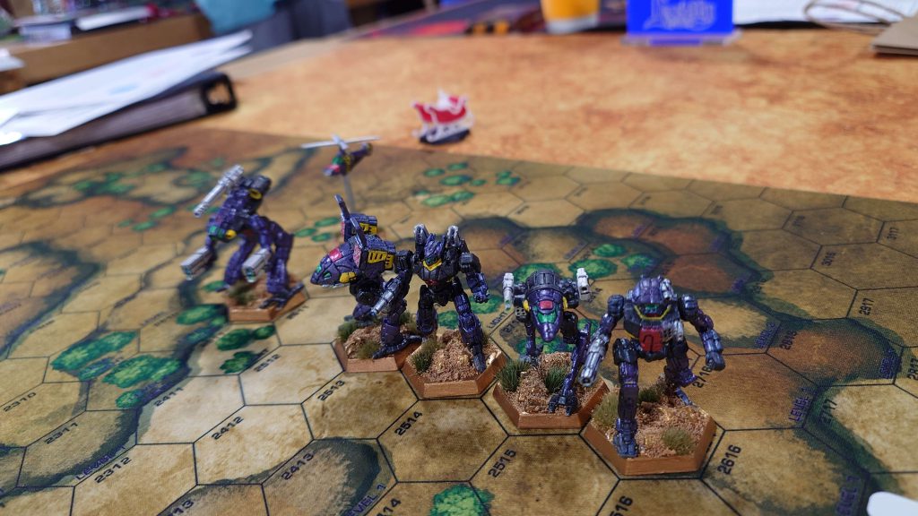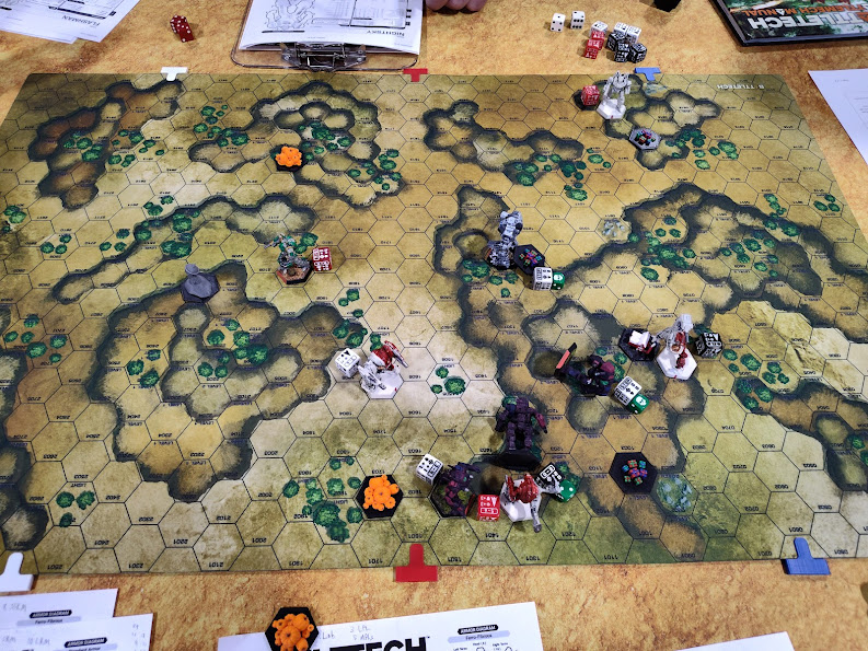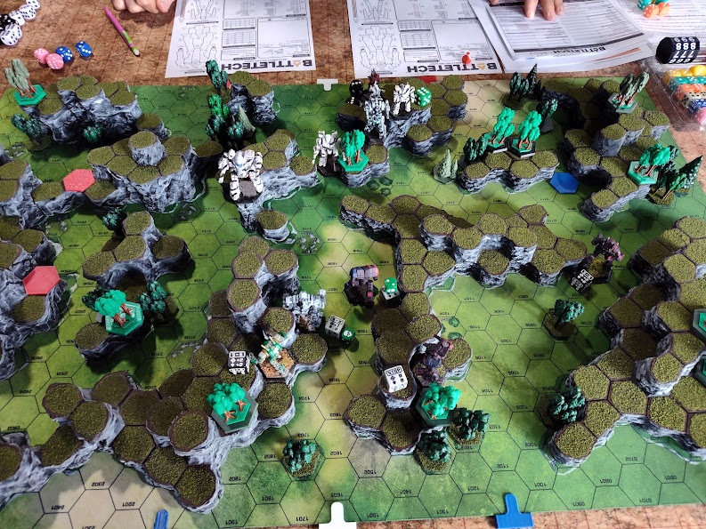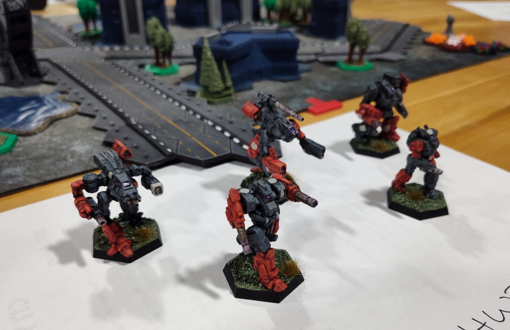 Incidentally, the bare-primer Phoenix Hawk in my photos of this game was the stand-in for Bill’s Stealth… he had an actual Stealth mini ready to go, but sadly his cats decided to make a toy of it the night before.