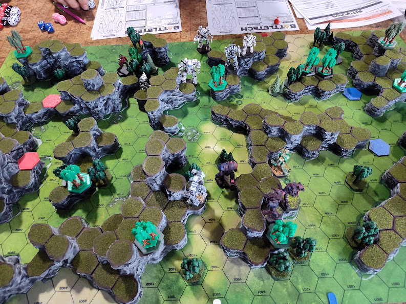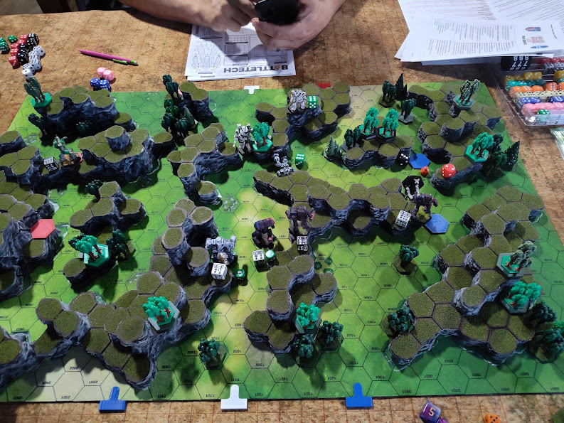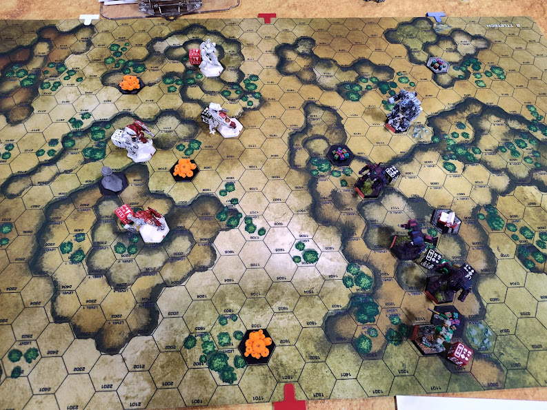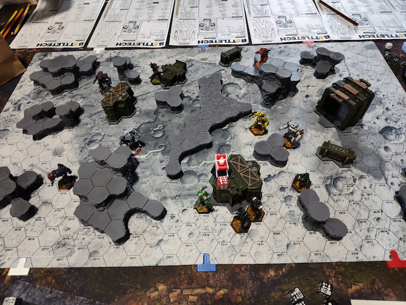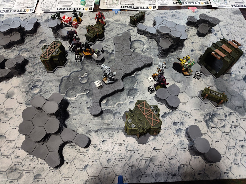 We were on the lunar battlemat for this round, and I’m EXTREMELY pleased to report that my complaint from Summer Fever was noted and the added 3D elements all had their hexes delineated this time around.