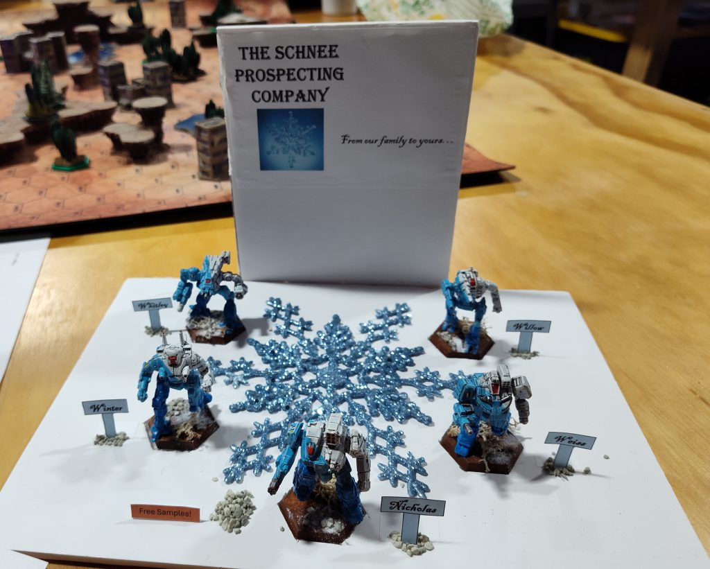 ChahDresh’s winning Mercenary list was the biggest beneficiary of the mission pack’s predilections, and I say that as no knock on his skill: he’s a phenomenal player, and his consistent tournament performance is all the more impressive when you know that he’s an out-of-towner whose local community almost exclusively plays Alpha Strike. He happened into a perfect list this time, though, in pursuit of a theme. He’s the player who paints all his Inner Sphere ‘Mechs with RWBY-inspired colors based on their Alpha Strike Roles, and he decided to go all Schnees for Toys for Tots due to the Christmas theming, since the founder of their family in the show is a Santa Claus expy. The upshot of this is that he limited himself entirely to ‘Mechs with the Skirmisher role. He ended up bringing a Thunderbolt 9SE, Starslayer 3C, Wolverine 7K (with one ton of Infernos for utility), Bushwhacker S2 (technically a Sniper, but most Bushwhackers are Skirmishers, so I’ll give it a pass ;] ), and the star of the show, an Ostsol 8M upgraded to 4/2 skills. (It looks like everything else was 4/5 except for the Wolverine at 4/4; this put him at 7,888 BV, which also let him flex by winning the tournament with literally the lowest-BV list in contention.)
