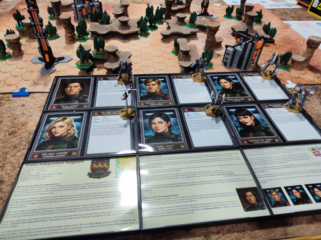 Third went to Kevin C., who brought an elaborate spread including detailed lore for his mercenary force, including their participation in the Toys For Tots “Charity Military Exercise” itself, including custom pilot cards for all of his units. The pilot cards used AI art, unfortunately, but you may recall from my shout-outs in the Summer Fever article that I do actually like his Zeta-Gundam-Titans-inspired paint job on its own merits. He asked me if I’d include a pic focused on just his miniatures in this writeup, and I’ve done so below: