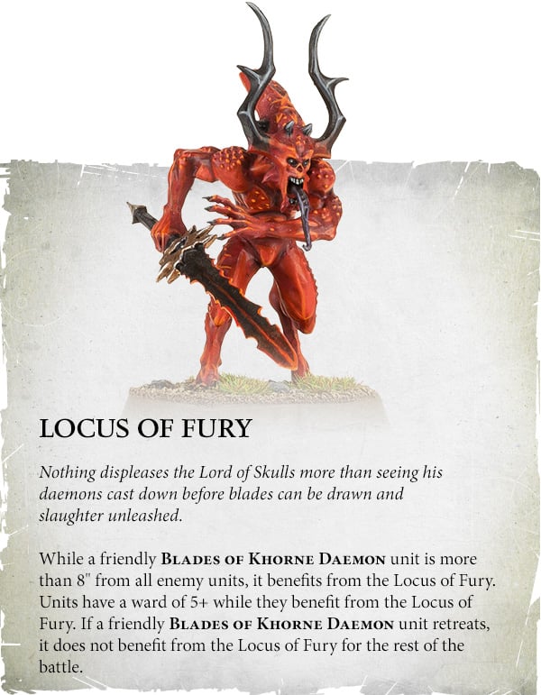 Credit: Warhammer CommunityFor the Daemon players, Locus of Fury gives all your Daemons a 5+ Ward if they are more than 8" from all enemy units. An extremely handy little buff that keeps your precious Bloodthirsters from being shot off the board turn 1.