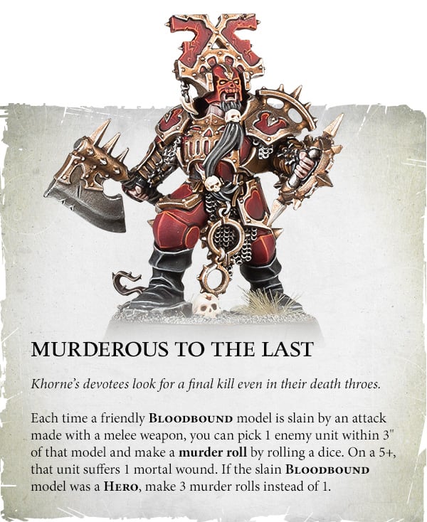 Credit: Warhammer CommunityEvery Bloodbound unit (a keyword shared with all mortal units) gets this buff. Whenever a model is killed, roll a "murder roll" (yes it is called that) and on a 5+, deal a mortal wound. Heroes get 3 dice. A few individual warscrolls also roll more dice than usual.