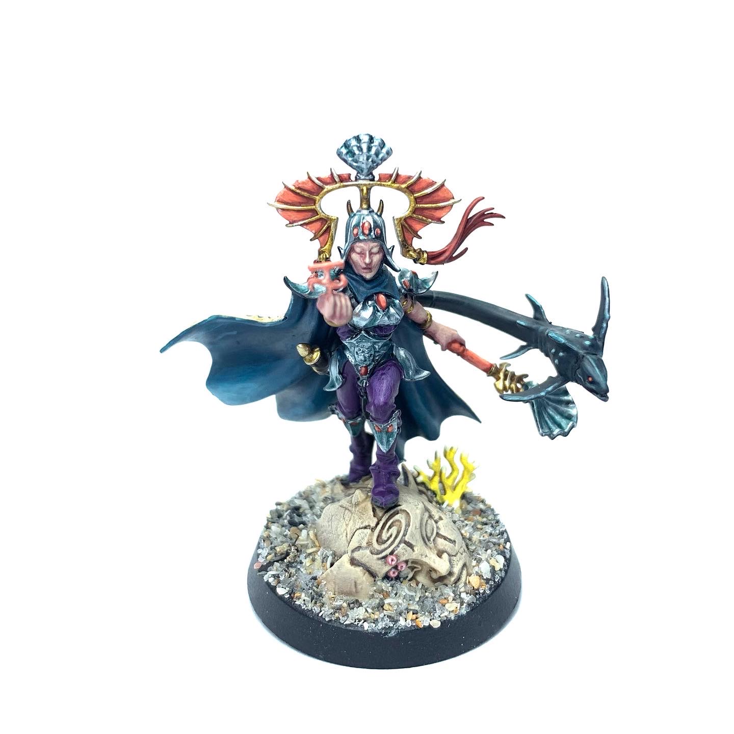 In the lore, Idoneth were a sort of "first draft" for Teclis when creating Aelves for the new Mortal Realms, before he settled on the Lumineth. This early experiment didn't go so well, creating horrific soulless abominations. Teclis could not bear to look at them and attempted to exterminate them all, but they fled into the depths of the boundless oceans of the Realms and hid. Teclis stayed his hands and left, and the Idoneth became deep sea raiders who swim to the shoes of unsuspecting villages and steal away innocents to harvest their souls. As the Idoneth have no souls, most who see them and survive do not remember the encounter, only recalling a faint shimmering outline.