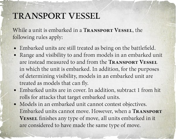 - Disengage - The ship and units embarked can retreat and still shoot later in the same turn.