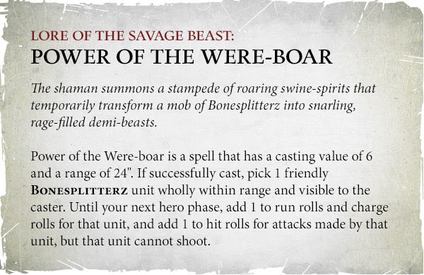 Cut down to four spells, and what a rollercoaster this is.Foot of Gork has returned from the first edition Ironjawz tome. Stunning. A whopping Casting Value 10 gets you D6 mortals and then you get to keep rolling 4+s until you fail to do so, doing D6 mortals every time. Is it good? probably not, too chancy and an insane casting value but very fun. I'm surprised it's back and glad for it.