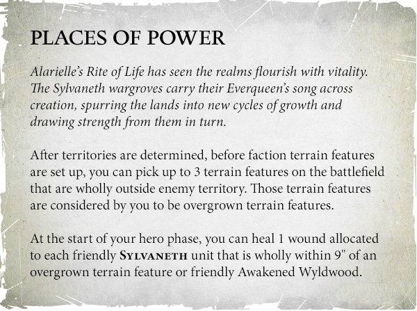 When setup is finished you can pick 3 pieces of terrain that are wholly outside your opponent's territory. These become Overgrown and function as Wyldwoods for most rules. That means any rule that uses a Awakened Wyldwood, whether it be healing, teleporting, or whatever, you can use your Overgrown territory as well.