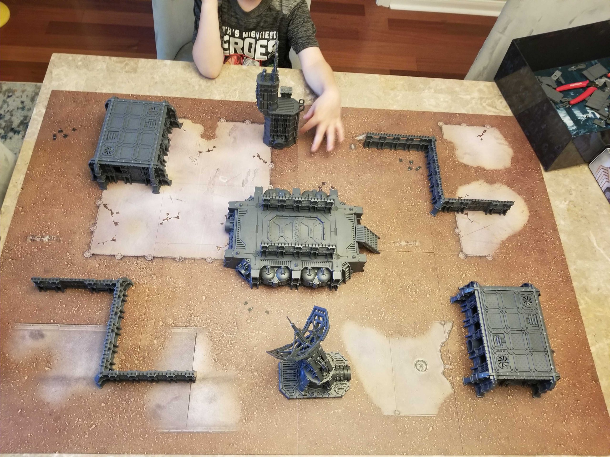 So you're a 40k player and you bought this terrain. Now what? Well the next step is to use it to build a battlefield. I'm not a huge fan of this terrain for competitive play - it's not tall enough, excepting the situation where you stack a fronteris building on top of the landing pad - and as with other 40k terrain, everything is filled with windows and gaps that don't block line of sight. This means the terrain works best for small games - Incursion or smaller - where hiding vehicles isn't super necessary (they're tough enough to last a turn or two, generally), and infantry can just hide behind the walls as needed.
