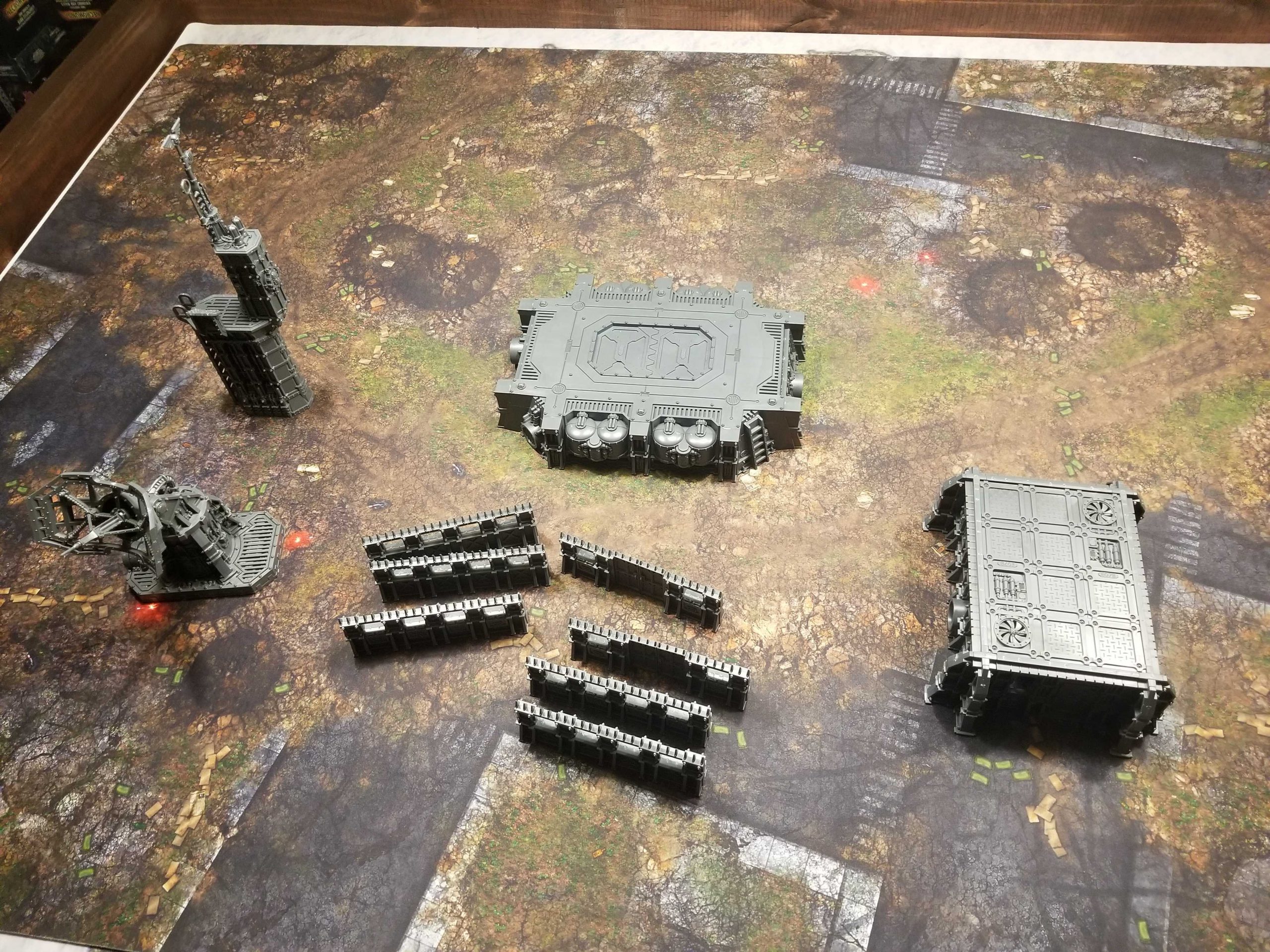 This creates four large, ruin-like terrain features to block line of sight (although not 5" tall, I'd treat these as Obscuring), and if you add bases for them to create footprints that will further improve things. This leaves you with two hab-bunkers left over but I don't particularly think that dropping them on top of the landing pads is helpful for making 40k terrain - it looks great but makes the feature basically useless for traversal.