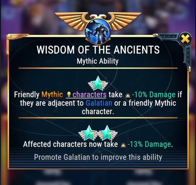 The other half of Mythic, besides just Number Going Up, is the introduction of Relics. These are the heart and soul of Mythic-ness and the main incentive to get those blue stars. When a character ascends to Mythic, one of their three equippable-item slots turns into a Relic slot. The other two slots can just equip boring old Mythic items, which are like Legendary items (armor, crit boosters, etc.) but with higher stats. The Relic is something else.Relics offer the same stats as the item they're replacing, but they also come with a special, tailored bonus. There are some "shared" Relics which can be equipped by multiple characters, but each character is also going to get a unique Relic just for them. For example, Aethana's unique Relic is the Phoenix Gem, which replaces her Block Booster. Like a normal Block Booster, it increases her Block chance and amount, but it also gives her a special ability: the first time each battle she's killed, she will revive with X health remaining, even if overkilled. X will be a scaling number that improves as the Relic levels up.