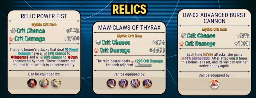 what re'vas really needed was a reusable active. Credit: ">NandiOnce you apply a Mythic item, Relic or not, you can't unequip it except to replace a Mythic item with a Relic (or replace a shared Relic with a unique Relic). I think this is not going to come up too often, but it's something to keep an eye on. Oh, and when Mythic characters are downscaled (i.e. in Guild War, Tournament Arena, and other rarity-capped modes), their Relics lose their unique ability... which is sad, but probably necessary for game balance.