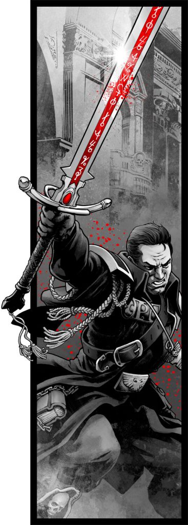 Contrast this, say, with Dan Abnett's depictions of blade-fighting. If Abnett is a trained swordsman he's been rather quiet about it, and his depictions- often climactic- tend to be painted in broader strokes rather than finer details. You'd never confuse them with a depiction of fencing, and indeed remarked upon some of the tradecraft he's employed in the Illustrated and Annotated Edition of Malleus. There's a line wherein Eisenhorn describes the duel he's having thusly: