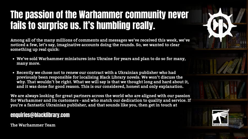 Spare a thought for poor Ukraine. On top of everything else it has going on right now, last week saw some corporate drama spill out into the open as Molfar, the company responsible for Ukrainian translations for the Black Library, announced that they'd lost the contract."This took us completely by surprise," said Molfar in a statement2. "Saying we’re shocked doesn’t even begin to cover it. For us, this was more than just a license. It was a community, readers, and a deep passion for the work and the books we published. We did everything we could to influence the situation, but we weren’t heard. Like you, we are fans of the universes with the same feelings – surprised, upset, and distressed. Unfortunately, we cannot change the rights holders’ decision."