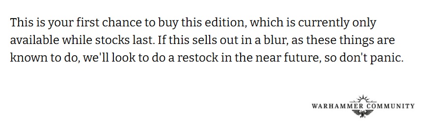 Image credit: Games WorkshopLike anyone else Games Workshop will ultimately be judged on results, not on intentions. But I find these developments promising. Time will tell whether or not this increase in availability is applied to other future releases or is just a one-off experiment, but the last thought I'll leave here is that we should remember that nothing happens in a vacuum. Scalpers are an unpleasant part of the collecting experience, but- unlike the targeted anti-scalper measures noted above- an increase of supply also can have unintended consequences for the consumer when it comes to resale value.