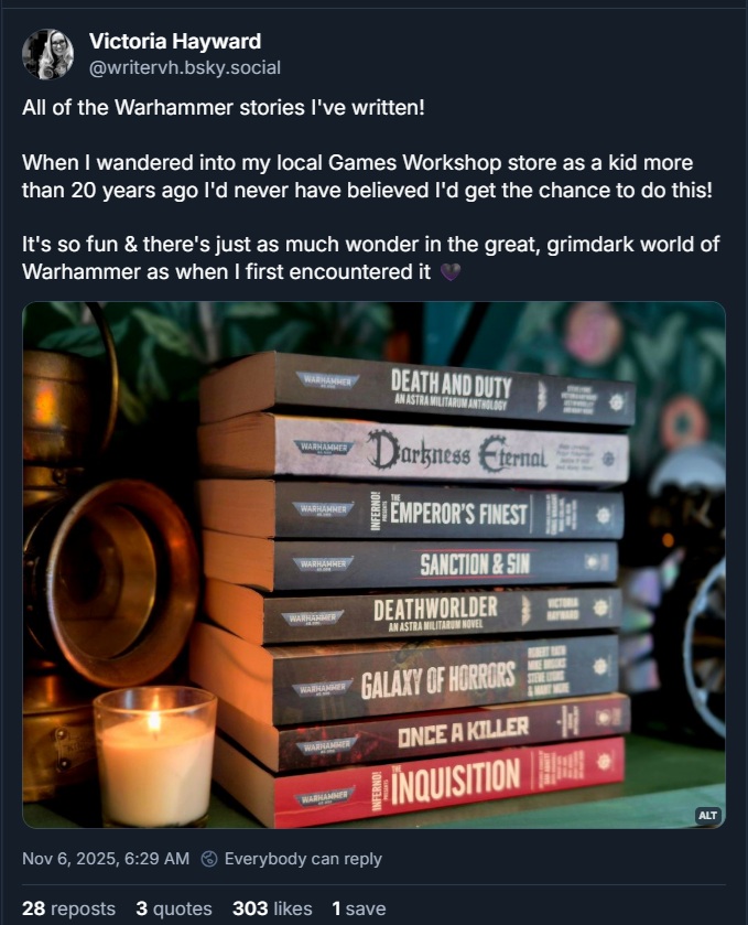 - Since we're talking about the Warhammer Conference down here in the footnotes, did you know that last year Hayward was a presenter? With "The Jungle Made Us: An Author’s Reflections on Writing Catachan", she shares some of her thoughts and insights from writing Deathworlder5.