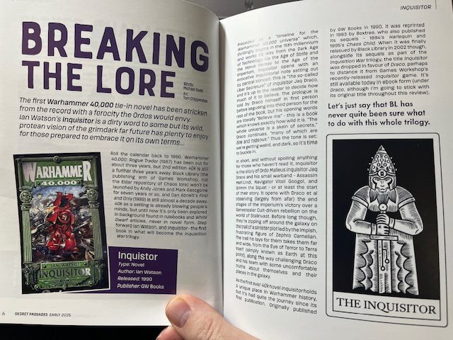 A zine that bills itself as being for "graph paper and bright green flocked base generation" of classic gamers, I picked up the debut issue of Secret Passages recently and what a treat. That's right, a full feature on Ian Watson's Inquisitor.Watson himself loomed large over the first installments of Goonhammer's ongoing 40K History of the Black Library series (first installment here), so it was fascinating to get another look at how his body of work for the Black Library has been regarded with the benefit of hindsight.
