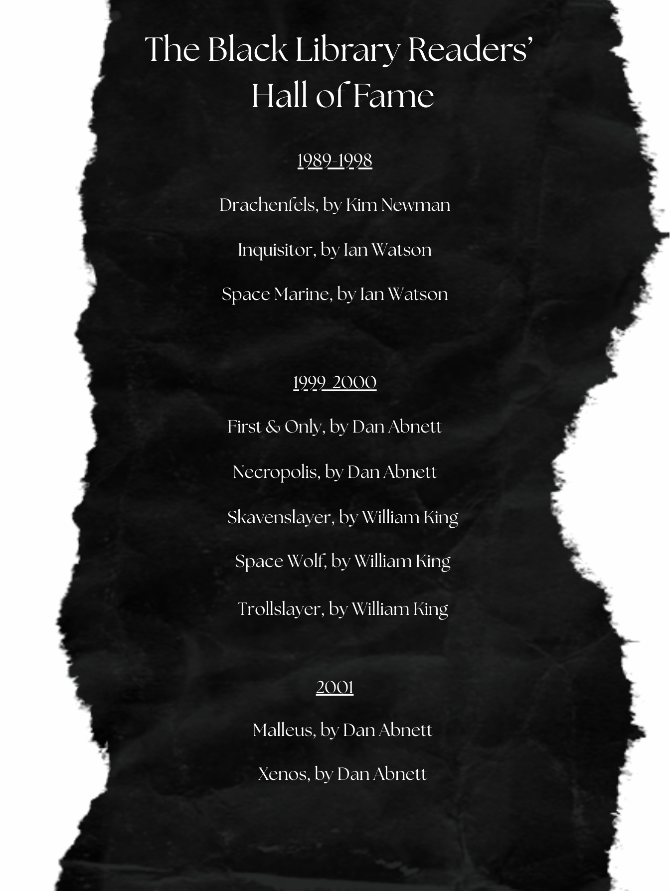 One of the most fun series I've been a part of this year is this Hall of Fame initiative. We're walking through the entire history of the Black Library with the help of our readers, seeing which books stand the test of time in our hearts and memories.So far we've had three "Classes" (1989-98, 1999-00, and 2001), and this coming Saturday will see us announce the winners from 2002. Make sure to tune in and cast your votes for 2003 as well!