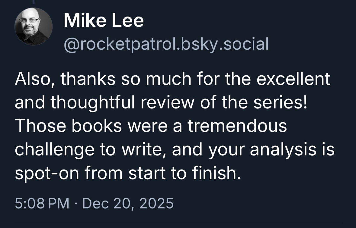 This weekend was a Warhammer Fantasy one-two for book reviews. Lenoon tackled the recently-rereleased omnibus The Rise of Nagash, by Mike Lee. Remarked one reader on the Black Library subreddit, u/King_Of_BlackMarsh, "I'm sure as heck picking these up. The [Blood of Nagash series] was excellent and I found a lot of fun in them as an AoS fan to see how it contrasts with AoS and how it sets up all I love about the setting." Mike Lee himself had quite a tip of the cap as well (see above).And speaking of Age of Sigmar, I had a look at Adrian Tchaikovsky's latest, the Seraphon-focused (and punnily-named) Starseer's Ruin. It's a terrific tale, an opinion echoed by reader David Patterson who noted "I've followed AoS since the beginning, and despite some early struggles I think it's really coming into its own as a setting now. Some of the best Black Library stories I've read this year have been AoS!"