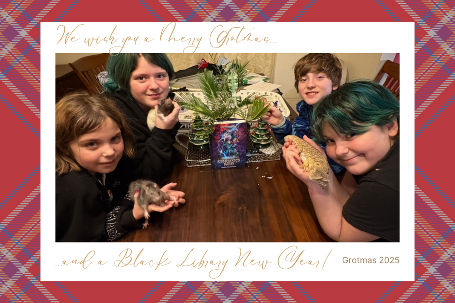 Speaking of Starseer's Ruin, our kids had fun (sorta) recreating the story with some of the family pets. From left to right, Team Skaven is Moira (with Abaddon) and Lorcan (holding Horus), then Team Seraphon is Declan (pointing at Cocomelon the chameleon in the fern... where else, right Oaxmal?) and Ruari with Tilly.From my family to yours, and from all of us here at the Goonhammer Black Library and Lore Team, a very Merry Grotmas to one and all. Thanks for reading us this year, and we can't wait to see what the next brings!